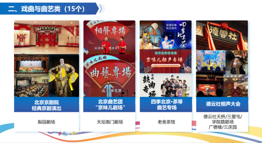 北京京剧院在梨园剧场推出经典京剧演出,为观众体验品茗赏戏的观演体验。前门的老舍茶馆推出四季北京·茶等曲艺专场,推出京韵大鼓、单弦、快板等曲艺表演。北京曲艺团、德云社、嘻哈包袱铺在天坛南门剧场、广德楼、嘻哈包袱铺五棵松剧场等场所推出相声曲艺表演。